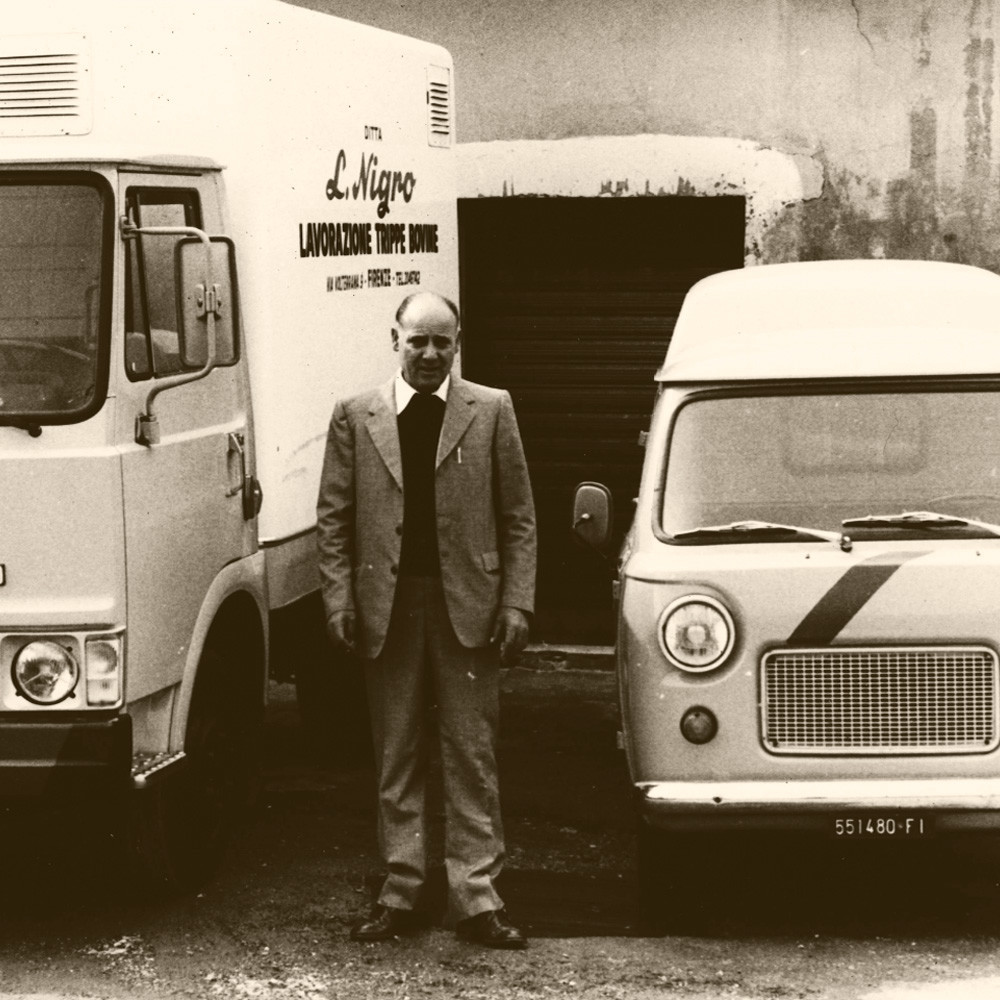 Con Mara e Luigi nasce la “Ditta Eredi L.Nigro”. Mara si guadagna da vivere con un chiosco di lampredotto in San Frediano, Luigi trasportando frattaglie in tutta la Toscana. È a lui che appartiene quella “L.” che sta nel nome dell’azienda e che – per combinazione – si adatta perfettamente anche al nipote Lorenzo. In bottega si cucinano la trippa e il lampredotto sulla stufa a legna. Una prima cottura dopo averle lavate a lungo, poi la spazzolatura e una seconda cottura in brodo, a fuoco lento. Un sapere antico, una ricetta di famiglia che passa al figlio Piero e poi a Lorenzo.