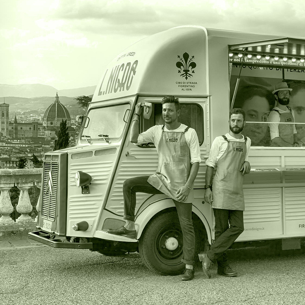 Oltre e ancora, perché non ci fermiamo mai. Oggi siamo alla terza generazione e nella Top 3 dei migliori streetfood d’Italia. Ci trovi ai concerti più grandi e agli eventi più spettacolari con il nostro cibo da strada. Quello fiorentino, quello buono. Organizziamo catering per eventi privati e noleggiamo i nostri bellissimi truck. Sempre a esplorare nuove strade, sempre alla ricerca di nuove opportunità. I nostri prodotti sono da leccarsi i baffi, per non parlare della sola e unica Lamprebox! Il quinto quarto ce l’abbiamo nel sangue. Continuiamo a scrivere una storia iniziata quasi ottant’anni fa dal nonno Luigi e dalla nonna Mara. Perché quella storia è la nostra storia.