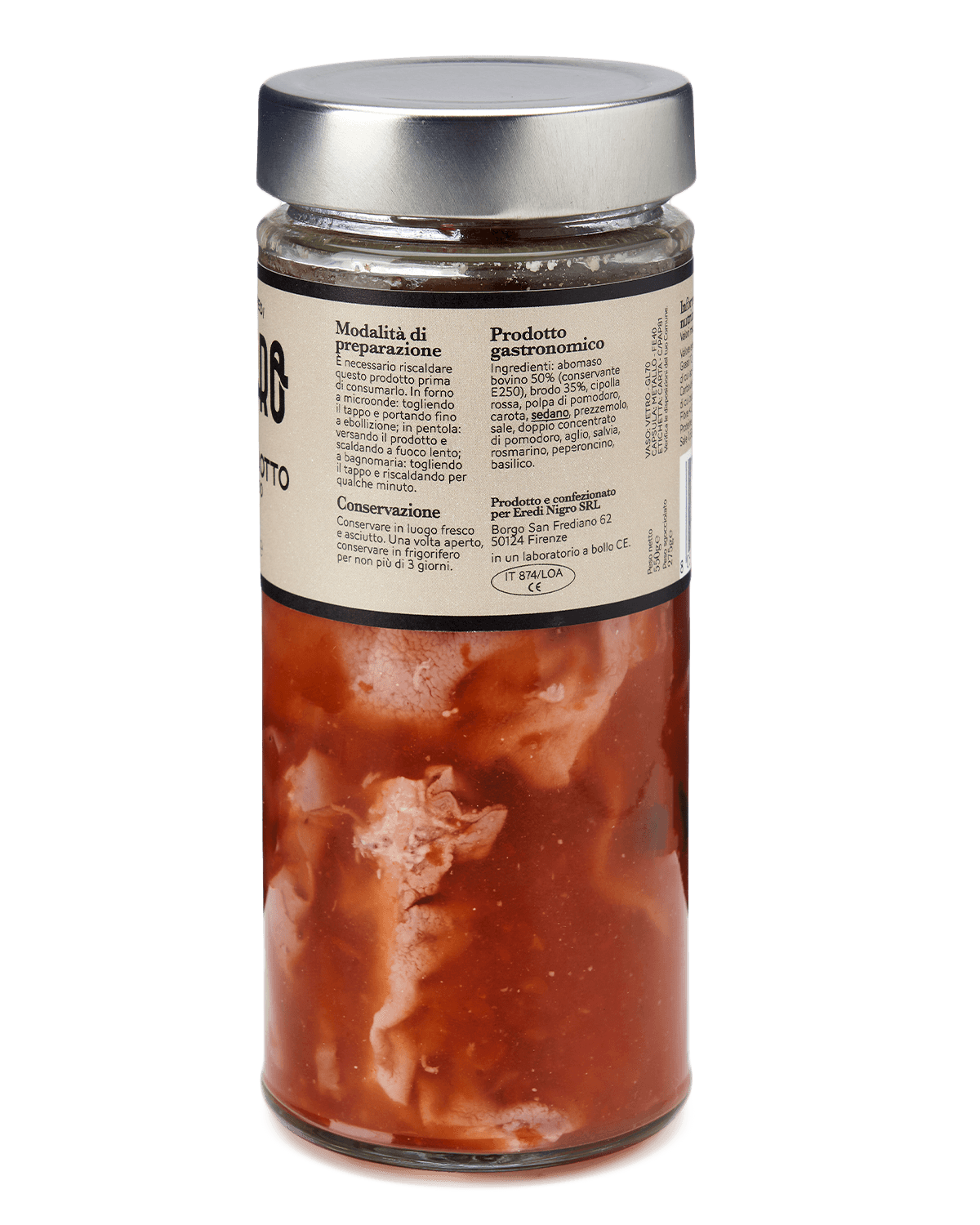 beef abomasum 50% (preservative: E250), broth 35%, red onion, tomato pulp, carrot, celery, parsley, salt, double tomato concentrate, garlic, sage, rosemary, chilli pepper, cinnamon.