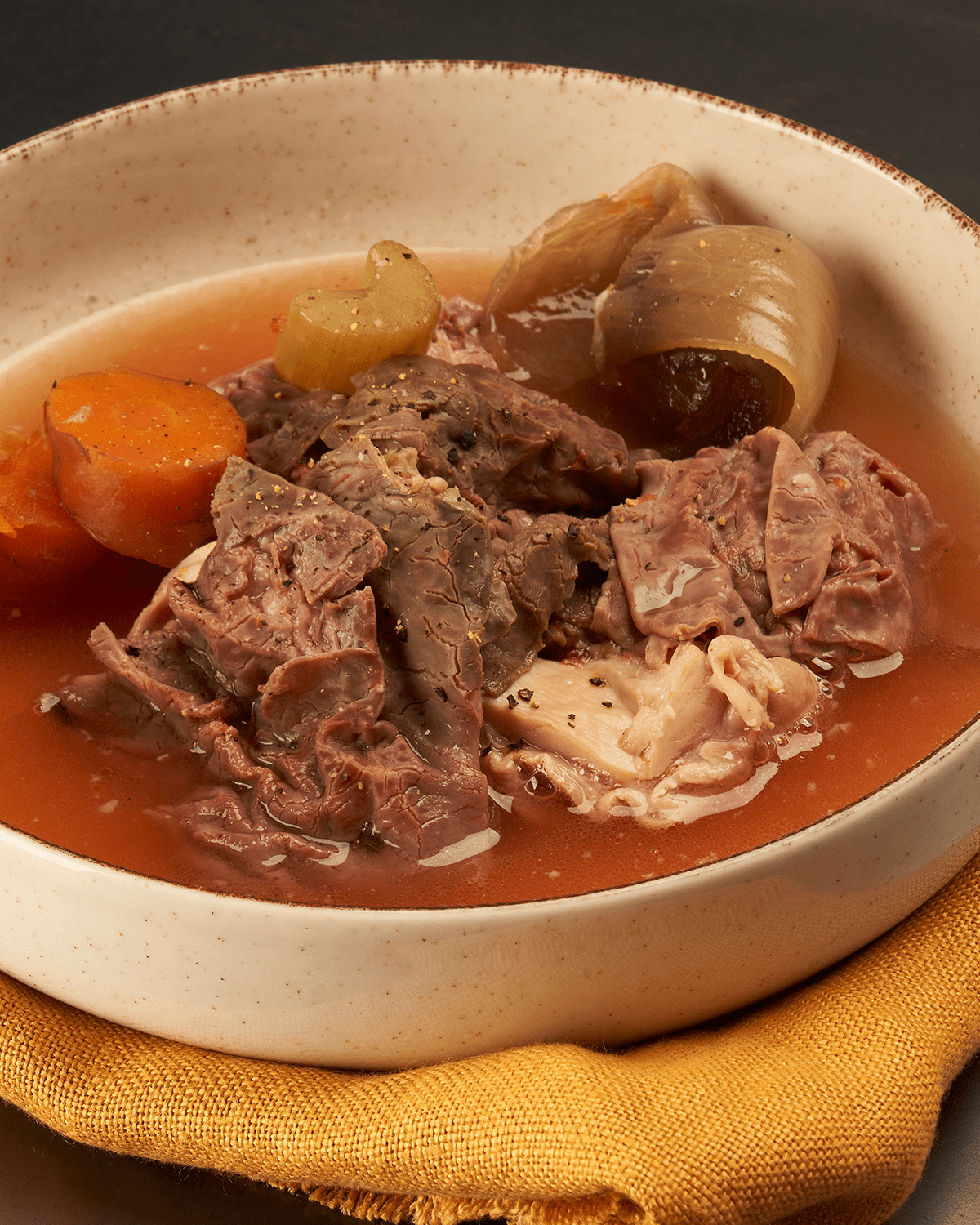 It is eaten inside a sandwich soaked in broth, seasoned with salt, pepper, spicy oil – for those who want it – and the ever-present salsa verde.